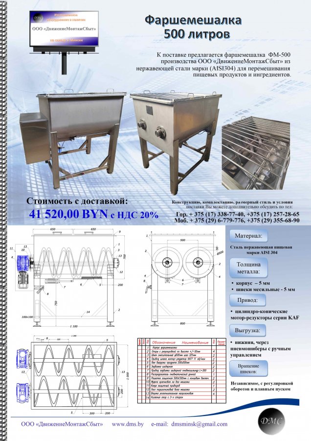 К поставке предлагается фаршемешалка ФМ-500 производства ООО «ДвижениеМонтажСбыт» из нержавеющей стали марки (AISI304) для перемешивания пищевых продуктов и ингредиентов.