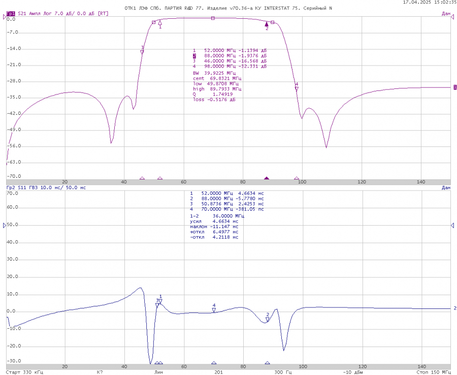 Фильтр LEFLFIF70.36I30Z75-HT0-001( микросборка v70.36.d12-a) предназначен для селекции сигналов в полосе 36 МГц с минимальной неравномерностью ГВЗ в полосе пропускания.