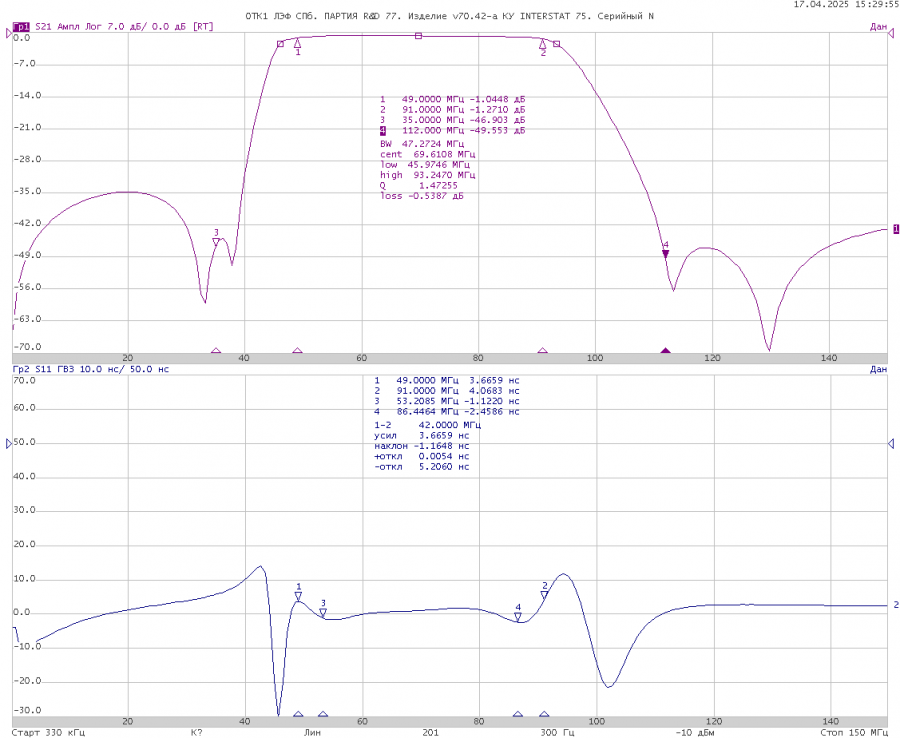 Фильтр LEFLFIF70BW42D06Z75-HT0-001( микросборка v70.42.d06-а) предназначен для селекции сигналов в полосе 42 МГц с минимальной неравномерностью ГВЗ в полосе пропускания.