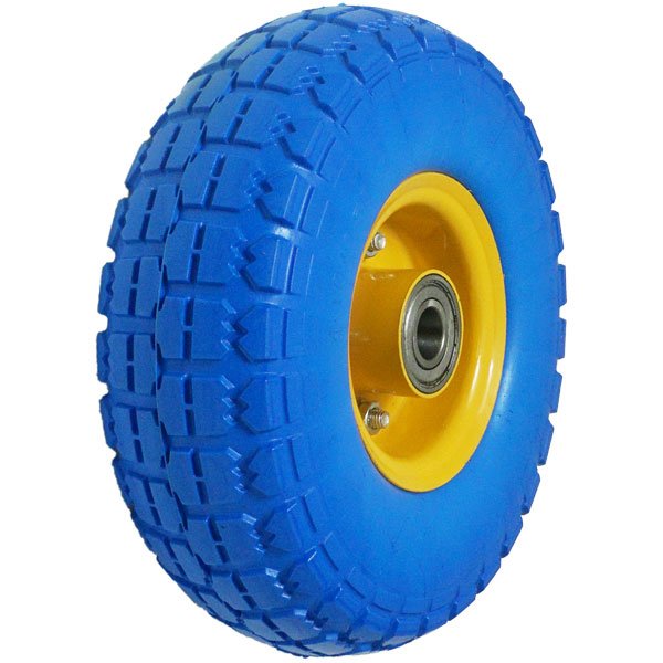 Колесо пенополиуретановое симметричная ступица EW 1800-4/5, бескамерное (антипрокол), диаметр колеса 260 мм. Цвет диска - желтый. Цвет шинки - синий. Ступица колеса симметричная. Смещение ступицы внутрь с обеих сторон - - 6,5 мм. Тип осевых подшипников - шариковый стандартный 6204zz. Рисунок протектора поперечный. Маркировка на шинке - 4.10/3.50-4.
