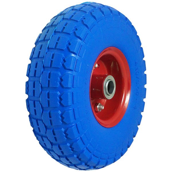 Колесо пенополиуретановое симметричная ступица EW 1802-1, бескамерное, диаметр колеса 260 мм. Цвет диска - красный. Цвет шинки - синий. Ступица колеса симметричная. Смещение ступицы внутрьс обеих сторон - - 5,5 мм. Тип осевых подшипников - шариковый нестандарт. Рисунок протектора поперечный. Маркировка на шинке - 4.10/3.50-4.