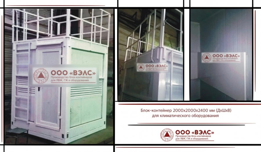 На фото контейнер для климатического оборудования размером 2000х2000х2400 мм (ДхШхВ). По периметру установлены съёмные перила, кровля выполнена с рифлёным полом толщиной 4 мм. На крыше предусмотрена установка мачты и дополнительного оборудования.