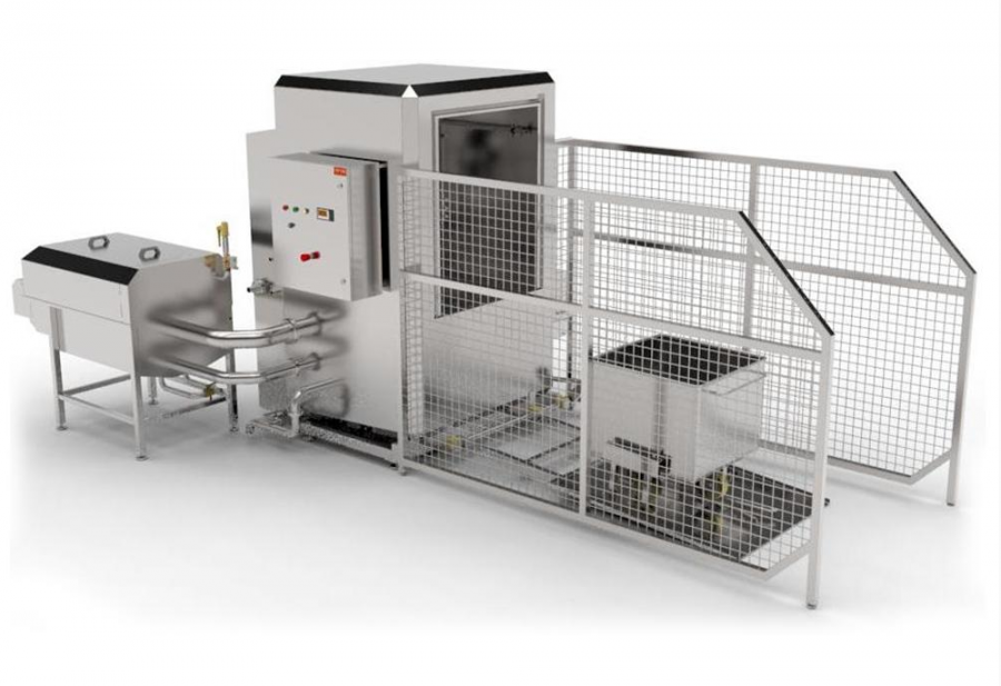 Для мойки используется щелочное беспенное средство, не вызывающее коррозию стали AISI 304. Автоматическая система контролирует и поддерживает заданную температуру и концентрацию моющего раствора. В базовой комплектации предусмотрены ТЭНы для подогрева раствора; также возможен нагрев паром, подаваемым в рубашку, встроенную в нижнюю часть оборудования.