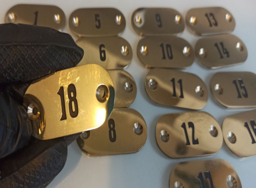 Номерки на кресла из латуни с гравировкой. Глубокая гравировка на латуни с последующей затиркой краской. Гравировка производится фрезером на высокоточном чпу станке и на лазере с чернением. Более подробную информацию можно получить на нашем сайте https://1nr.ru/uslugi/nomerki-i-birki/nomerki-iz-latuni/