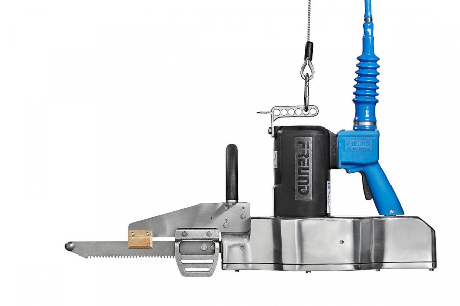 С помощью шаговой пилы ВВН 30-03 разделка туш сельскохозяйственных животных происходит быстро и аккуратно. Оборудование от немецкого бренда Freund соответствует всем требованиям безопасности и нормам гигиены, санитарии. Подвесная электропила весом 18,5 кг обеспечивает комфортную работу и качественный результат. Конструкция состоит из балансира, предупреждающего инерцию, мощного электродвигателя на 1 300 Вт, дугообразной рукояти управления и ручки с кнопкой старта и отключения. Распил производится острым режущим полотном, на котором предусмотрен механизм регулировки длины.