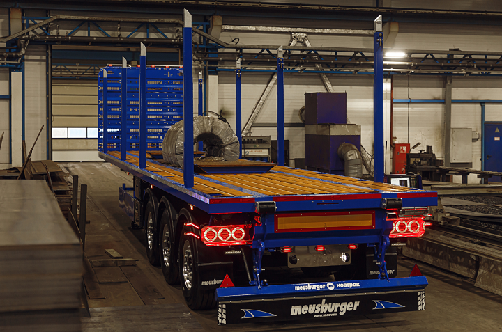 Полуприцеп-рулоновоз, выполненный по спецзаказу, оборудован 4 парами телескопических стоек производства Meusburger Новтрак (входит в Ассоциацию «Росспецмаш») и металлическими нишами длиной 5 метров для перевозки рулонов температурой до 150 С0.