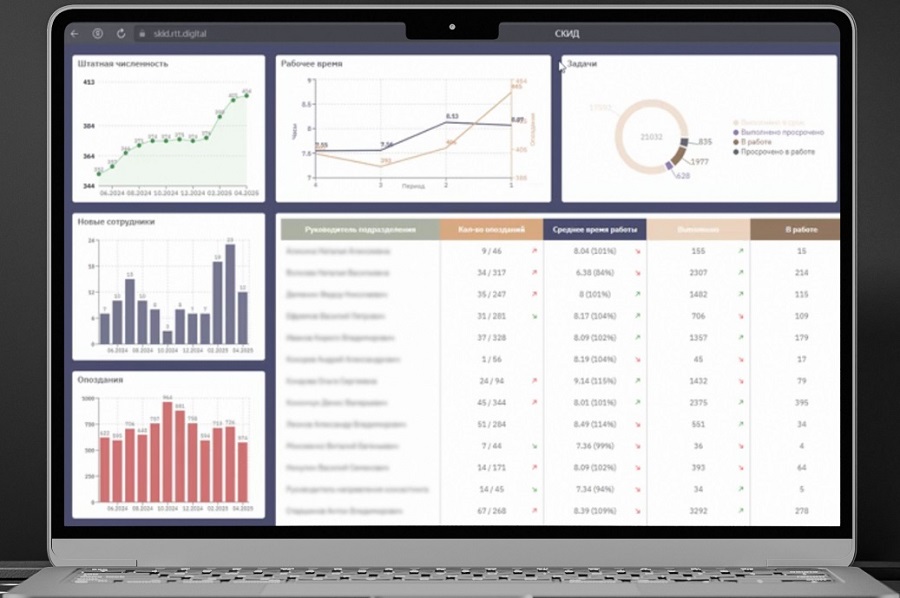 Решение агрегирует данные из различных корпоративных систем: CRM, СЭД, 1С, трекеры задач, СКУД, АТС и создает целостную аналитическую платформу. Система автоматически строит графики и таблицы, а также дает прогнозы на основе текущих трендов.