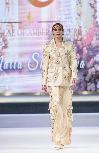 Новая линия одежды состоит из 15 комплектов. Мастера обработали около трех килограммов солнечного камня для создания всех элементов коллекции, показанной на подиуме в китайском Ханчжоу. Древний самоцвет использован в качестве акцента на воротниках, манжетах и лацканах пиджаков. Из янтаря выполнены пуговицы и съемные элементы костюма – пояса и головные уборы.