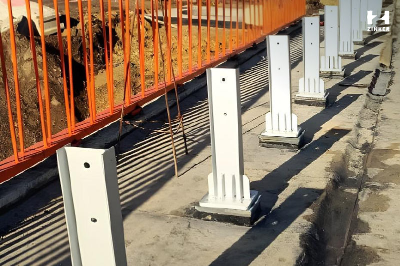В рамках реконструкции полностью заменили ограждающие столбики: использовался новый металл. Перед нанесением защитных составов провели обязательную подготовку поверхности — пескоструйную обработку. Этот этап крайне важен: он позволяет удалить старые покрытия, загрязнения и окалину, обеспечивая необходимую шероховатость для надёжного сцепления с антикором.