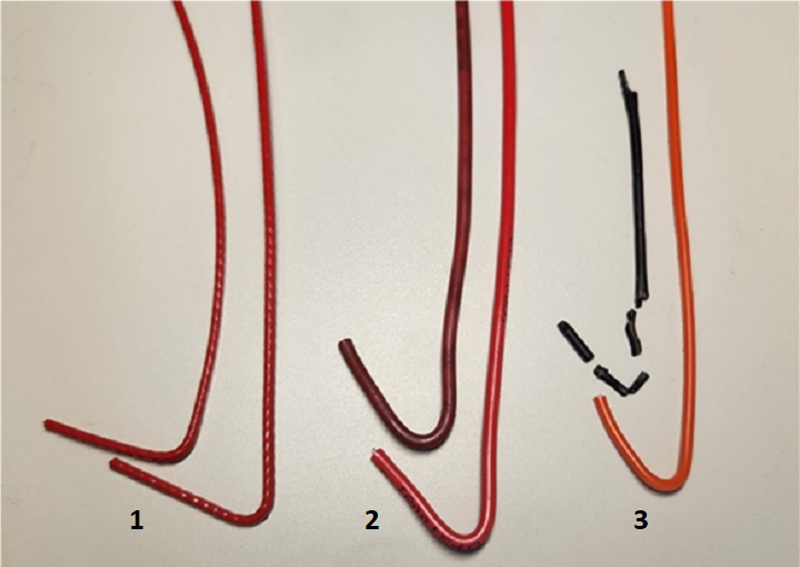 3 – образец другого производителя из бюджетной ценовой категории, при тех же условиях. Наблюдается обуглившийся и потрескавшийся пластикат, неподходящий для применения в сфере обогревательных устройств.