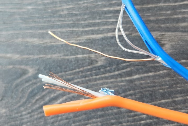 На фото результат проверки провода на наличие многопроволочной жилы (оранжевый провод – многопроволочная жила, синий провод – однопроволочная жила)