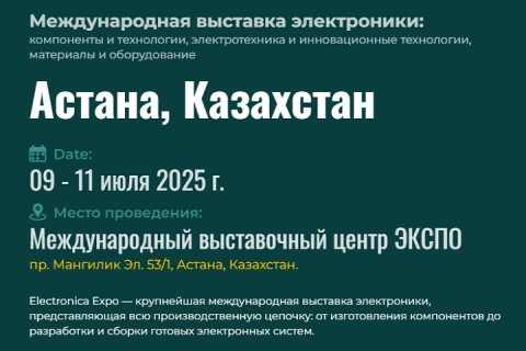 С 9 по 11 июля 2025 года в Астане, в Международном Выставочном Центре «EXPO», пройдет крупнейшая международная выставка электроники в Центральной Азии, Electronica Expo Kazakhstan 2025. Данное мероприятие объединит лидеров отрасли, новейшие технологии и передовые решения, а также предоставит всю производственную цепочку – от изготовления компонентов до разработки и сборки передовых элeктронных cистем.