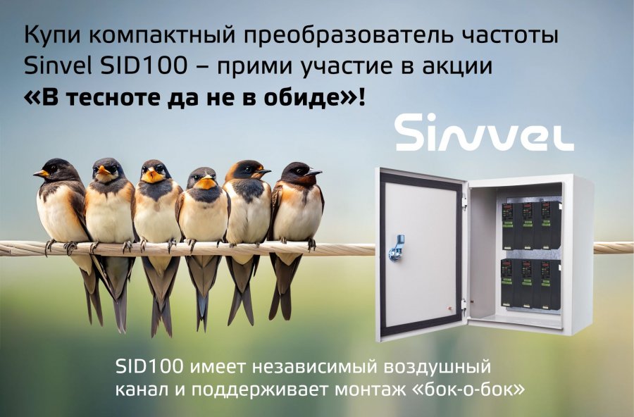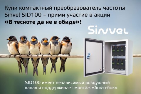 Покупая компактные преобразователи частоты Sinvel SID100 в период с 01.02.2025 по 30.07.2025, Вы можете принять участие в акции «В тесноте, да не в обиде».