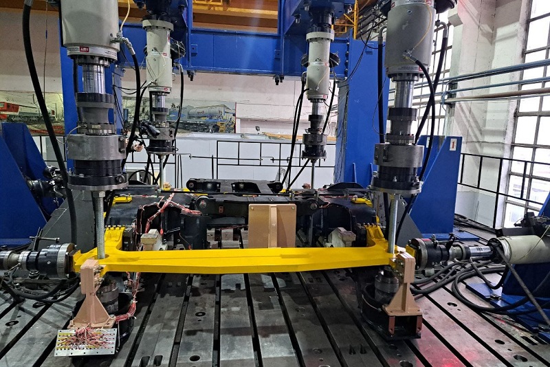 На первом этапе прошли циклические испытания. На специальных стендах рама моторной тележки выдержала 10 миллионов циклов нагрузки на прочность. Одновременно проверялись кронштейны, предназначенные для крепления тормозного оборудования, редуктора и тягового электродвигателя.